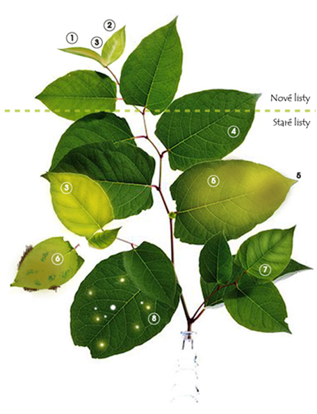 Žltnutie listu, žlté škvrny na listoch, ale žilnatina zostáva zelená, listy sa stávajú prehľadnými – sklovatejú |