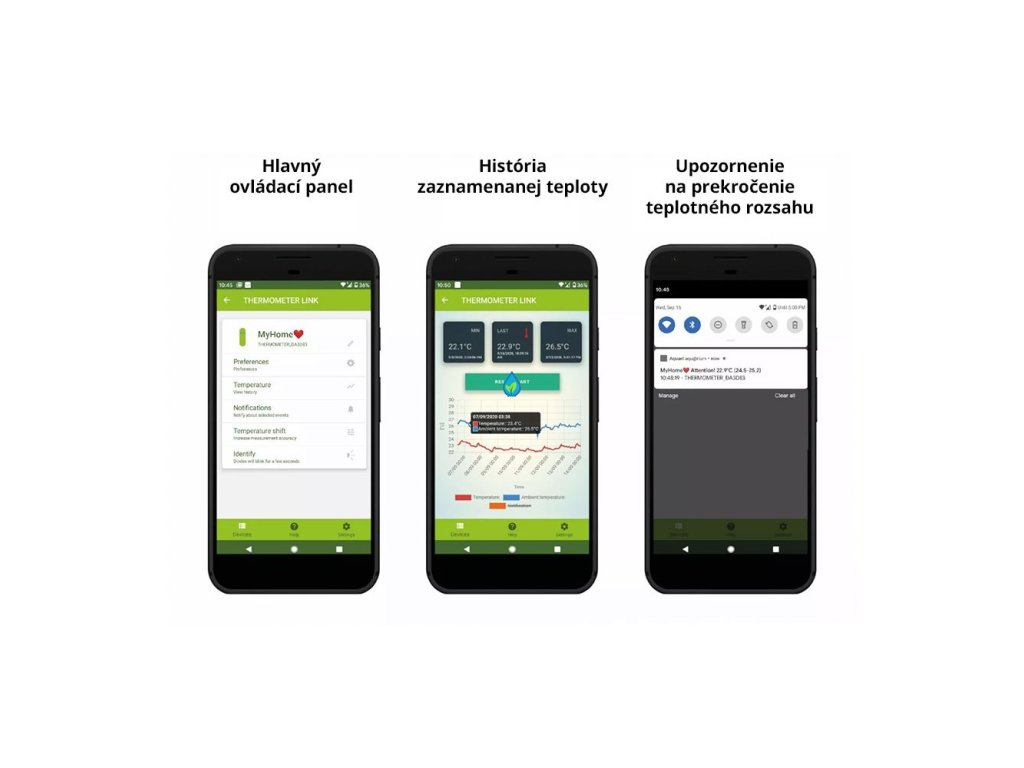 Umožňuje nastavenie požadovaného teplotného rozsahu (minimálna a maximálna hodnota). Keď je teplota mimo nastaveného rozsahu, aplikácia odošle alarmové upozornenia. Zariadenie zaznamenáva a ukladá údaje o teplote pre podmienky vo vnútri a mimo nádrže.