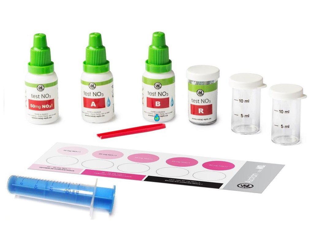 Balenie: Roztok A 20 ml 1x, Roztok B 20 ml 1x, Prášok R 1x, Porovnávací roztok 50mg NO3/8l 1x, Pokusné skúmavka 10ml 1x, Plastová naberačka 1x, Injekčná striekačka 1x, Porovnávací stupnice 1x, Návod na použitie 1x