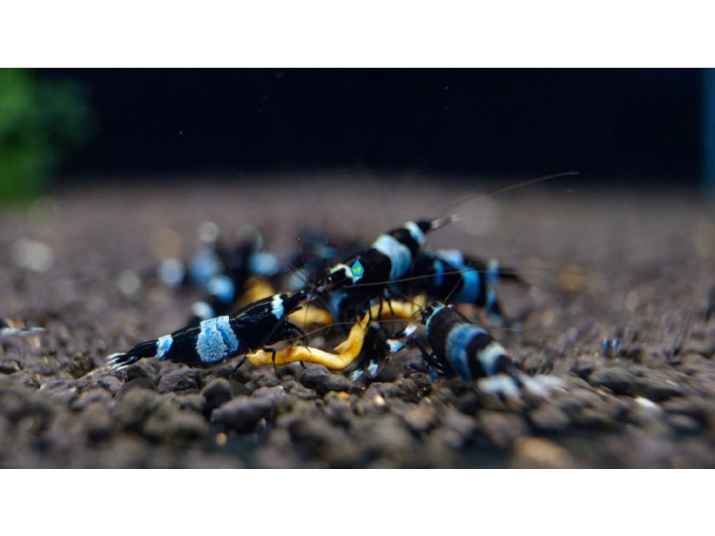 Caridina cf. cantonensis „Shadow Panda“ (známa aj ako Blue Panda) patrí medzi najvyhľadávanejšie varianty zo skupiny Taiwan Bee. Tento druh si získal srdcia akvaristov po celom svete vďaka svojmu nezameniteľnému sýtemu sfarbeniu, kde sa striedajú hlboké čierne pásy s mrazivo modrými až žiarivo bielymi segmentmi.