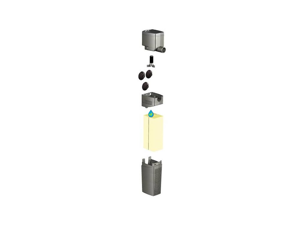 Filter štrbinou nasaje vodu, prefiltruje ju cez filtračnú vložku a ďalej ju vedie vyčistenú späť do nádoby.