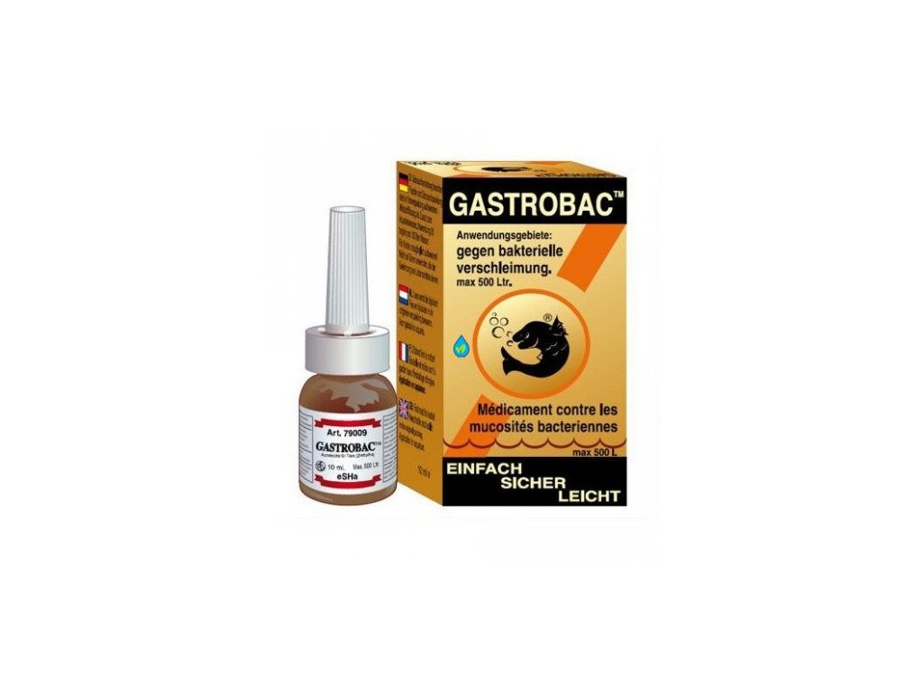 ESHA Gastrobac je výborný prostriedok pre okrasné ryby, ktorý pôsobí veľmi účinne proti bakteriálnemu napadnutiu kože a žiabier sladkovodných rýb. Účinný roztok pre pridanie do akváriové vody.