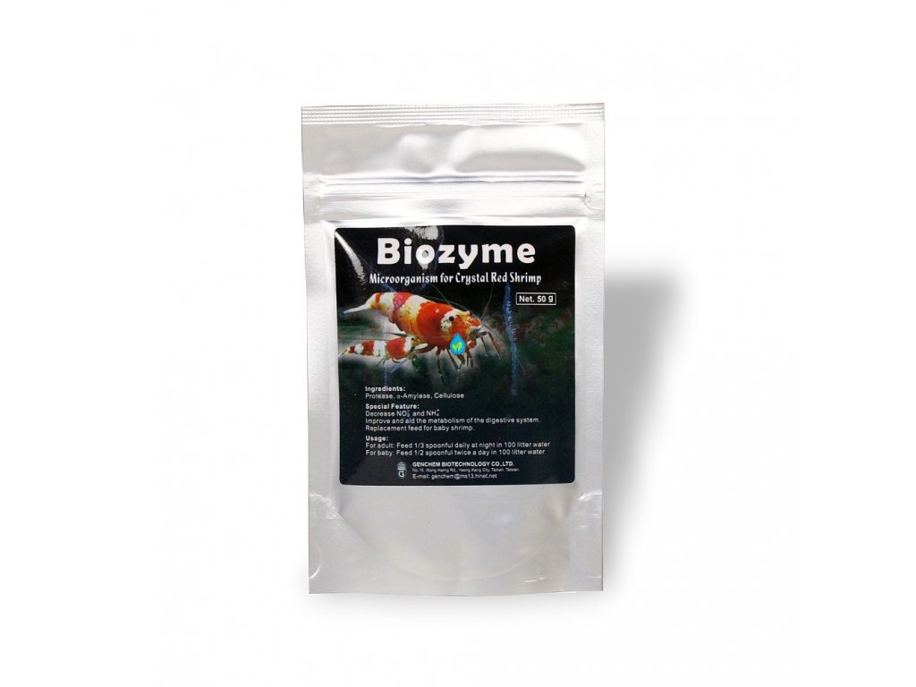 Biozyme je jemný prášok obsahujúci životne dôležité aminokyseliny a enzýmy pre krevety.