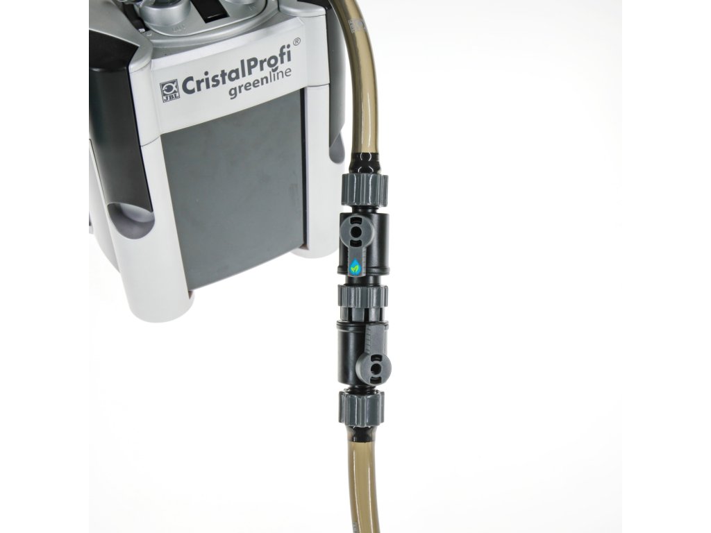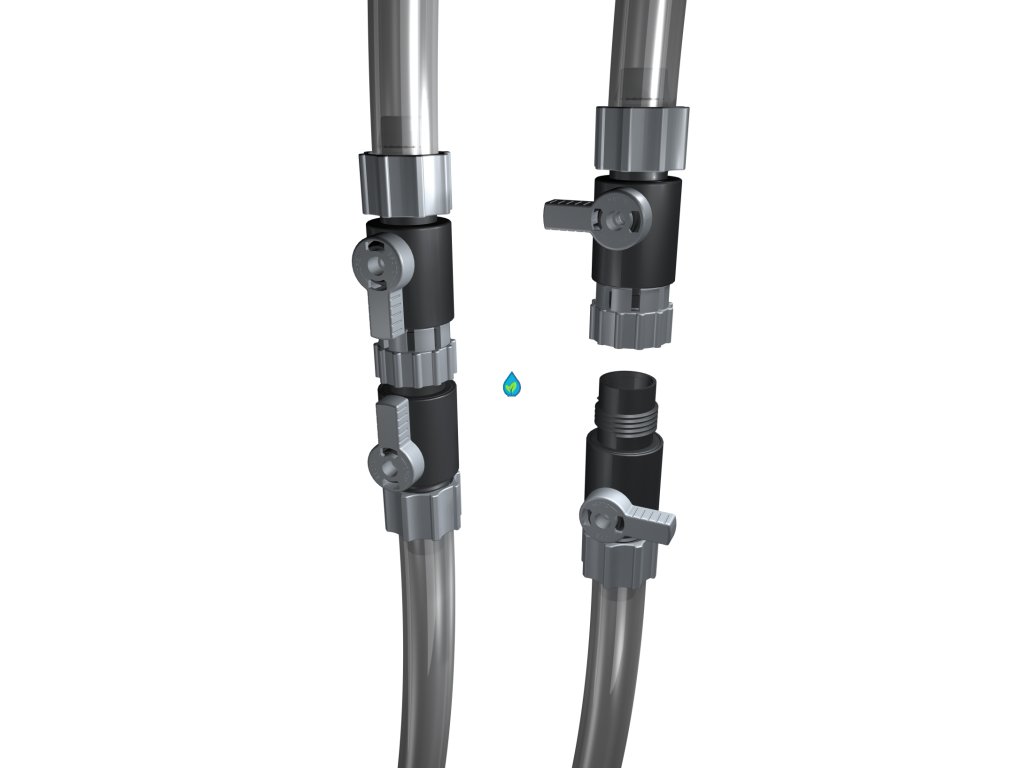 Dvojkohútom uzatvoríte hadice na jednej aj druhej strane a povolíte uprostred, čím viete pohodlne odpojiť externý filter a nebude vám vytekať voda z hadíc von.