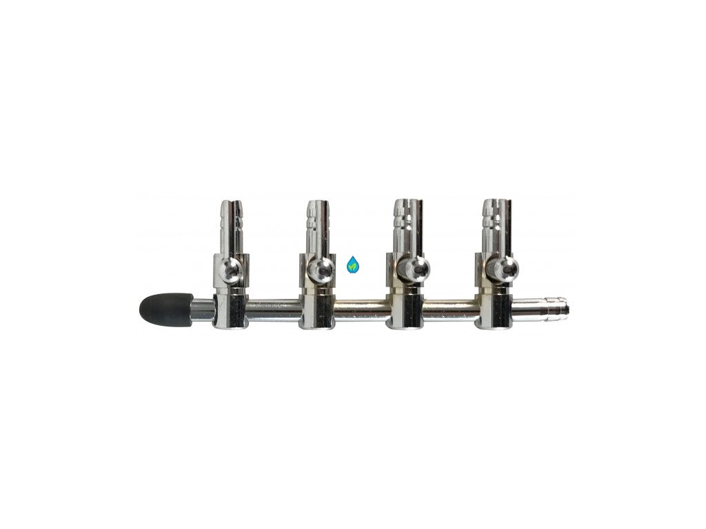 Kovový rozdeľovač so štyrmi ventilmi regulujúcimi prietok vzduchu na hadičku 4/6 mm.