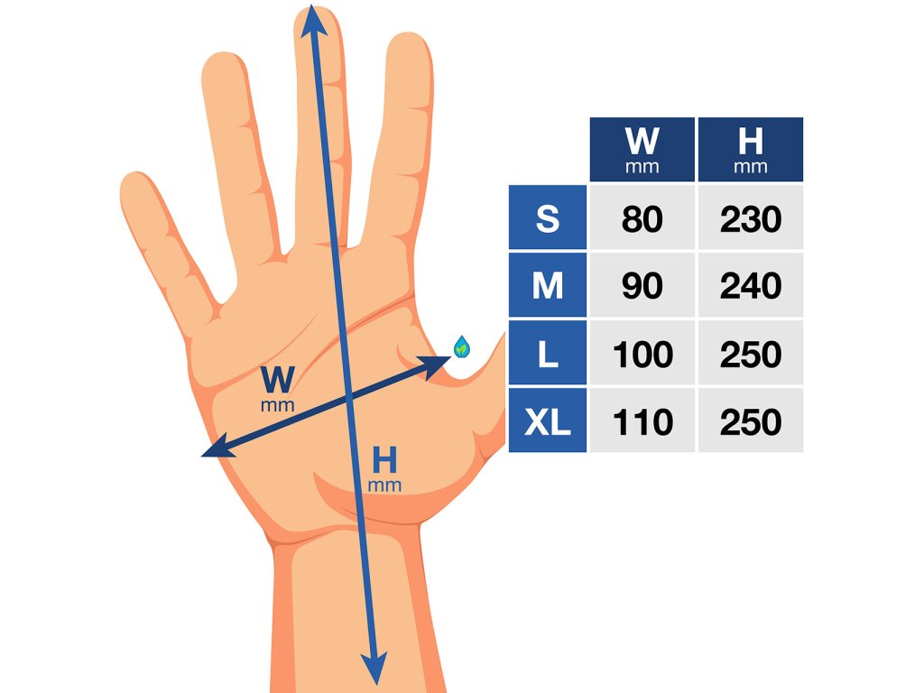 Na zistenie svojej veľkosti je potrebné odmerať šírku dlane hneď nad palcom (najširšie miesto na dlani).