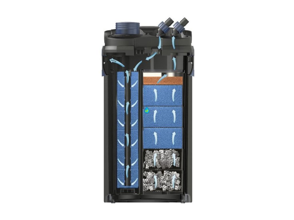 Filter je vybavený filtračným médiom vo forme špongií rôznych pórov a biologickým filtračným médiom patentovaným na Oase s názvom Hel-X.