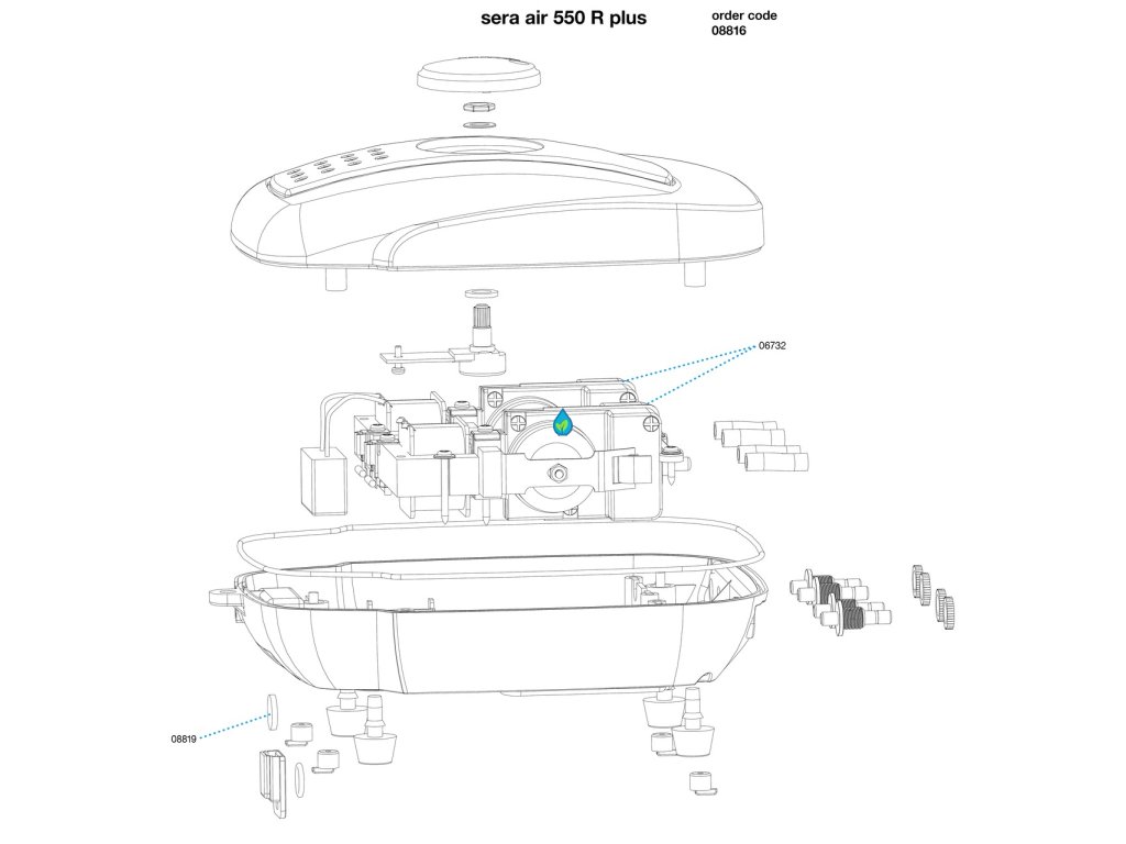 Sera air 550R plus – sera vylepšila membránové čerpadlá pre akvária a záhradné jazierka, s reguláciou množstva dodávaného vzduchu, max. 550 litrov vzduchu za hodinu.