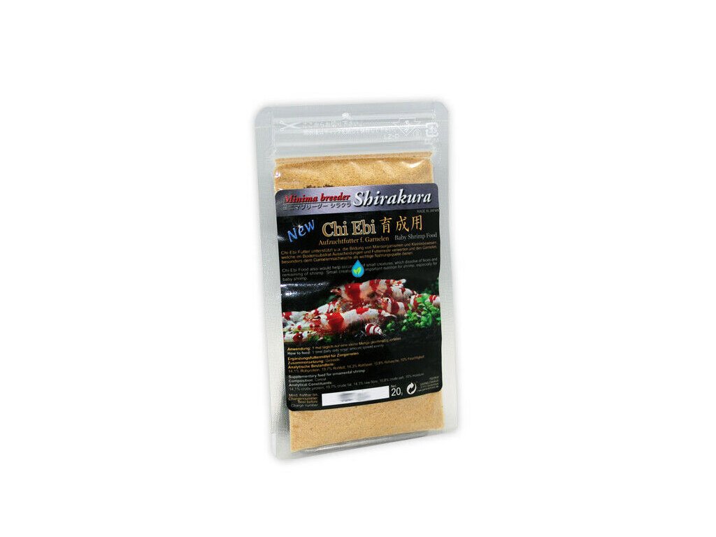 Shirakura Chi Ebi je profesionálne krmivo určené najmä pre mladé a čerstvo narodené krevety, ktoré potrebujú výživnú, jemnú a ľahko dostupnú potravu. Vyvinuté renomovaným japonským chovateľom Takayuki Shirakura, Chi Ebi podporuje rýchly rast, zdravý vývoj a vysoké prežívanie mláďat v akváriu.